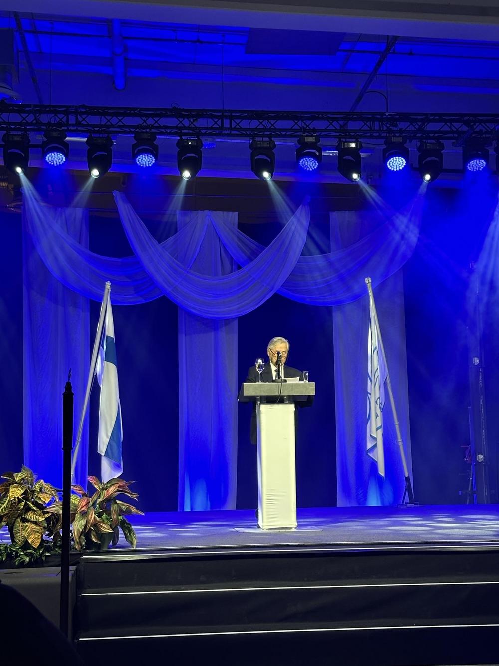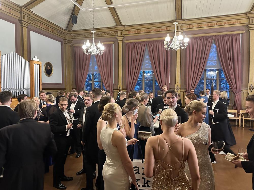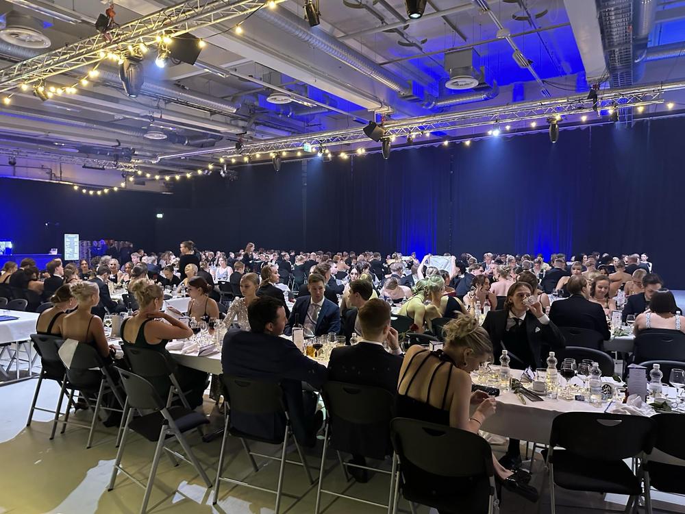 Itse juhlan kulkuun oli aikataulutettu konferensseja, joiden aikana oli lupa nousta pöydistä jaloittelemaan, kuvauttamaan itseään ”selfie automaatilla”, sekä aikaa laulutoiveille. Erinäisissä kansainvälisissä ohjelmissa, tilkkutäkkimäisesti ja ulkomaillakin opiskelleena, minulle ovat tutumpia rugbybileet kuin suomalaisten opiskelijajärjestöjen vaalimat juomalauluperinteet. Sanojen ystävänä nautin suuresti näistä uusista sovituksista mm. Leijonakuninkaasta tutulle Elton Johnin biisille: Tunnetko sä rakkauden ja Silja Linen -tunnarille. Hienoa oli kuulla toki myös tutumpia juomalauluja useampi satapäisen juhlayleisön kuorolauluna. Koska pöytämme tuli alkuun vain puoliksi täyteen, vitsailimme, että saisimmeko lainkaan istua juhlan aikana. Puoliksi tyhjä pöytä kuitenkin selittyi pian, kun alettiin kuuluttamaan paikalle kunniavieraita - meidät oli plaseerattu kunniavieraiden, kuten vuoden opettaja palkinnon saajan, sekä Pörssi ry:n perustajan - kyllä luitte oikein - vuonna 1968 Pörssi ry:tä perustamassa olleen Tapani Nummen kanssa. Tapani piti juhlassa myös puheen, jonka siivin koko juhlaväki pääsi hetkeksi 60- ja 70-lukujen taitteen opiskelijoiden elämään ja arjen haasteisiin mukaan. Tapani toimi aikoinaan kaksi ensimmäistä vuotta opiskelijajärjestön puheenjohtajana. Tällä hetkellä pestiä hoitaa Leevi Leijon, joka saatteli Tapanin pöytäämme.