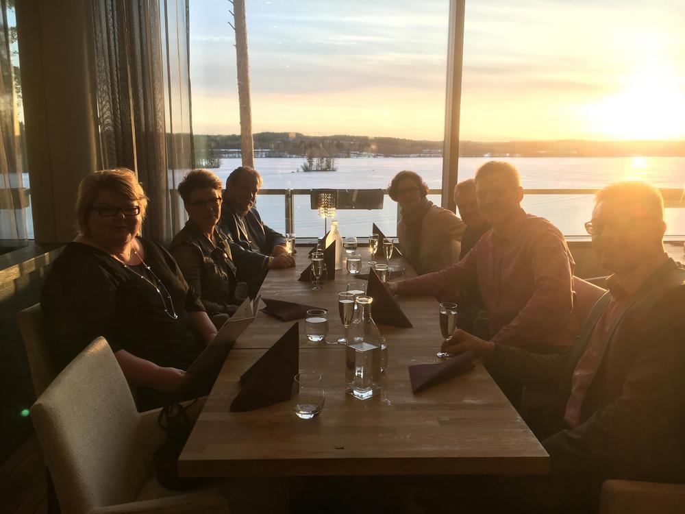 Illan alku vietettiin hyvän ruuan ja seurustelun parissa, komeasta auringonlaskusta Peurunka-järven taakse nauttien. Ruokailun yhteydessä innovoitiin mm. uutta liiketoimintaa Peurunkaan; jalkapallohalleja Keski-Suomessa ei ole liikaa. Samoin metsäliiketoiminnan tulevaisuus oli tapetilla, siihen on vahva usko.