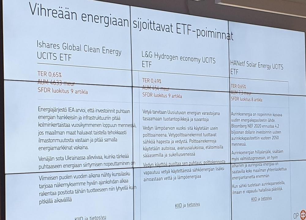 lIlan aikana keskustelu oli vilkaista ja kysymyksiä liittyi esimerkiksi siihen miten tehdään sijoitusten ESG-analyysit, löytyykö mitään ’turvasatamia’. Geopolitiikkaa sivuttiin niin Venäjän kuin Kiinankin suhteen…Yhdysvaltojen markkinat selviävät vähemmällä. Tässä tilanteessa sijoittajien tulee miettiä omaa riskinsietokykyään. Osakepoiminnalla voi onnistua, mutta se ei ole niin ’helppoa’ kuin on ehkä totuttu. Hajauttaminen, hajauttaminen, hajauttaminen – se toistui. Myös Suomen pörssin asemaaa reunamarkkinana käsiteltiin. Yksittäisiä rahastoja esiteltiin esim. vihreään energiaan liittyen.